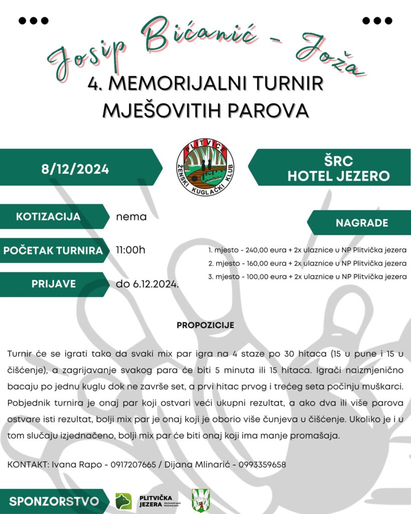 Ženski kuglački klub Plitvice organizira 4. Memorijalni turnir mješovitih parova “Josip Bićanić – Joža”. Turnir će se održati 08. prosinca 2024. u kuglani hotela Jezero, smještenoj u prekrasnom okruženju Nacionalnog parka Plitvička jezera. Početak turnira je zakazan za 11:00 sati, a prijave su otvorene do 06. prosinca 2024.