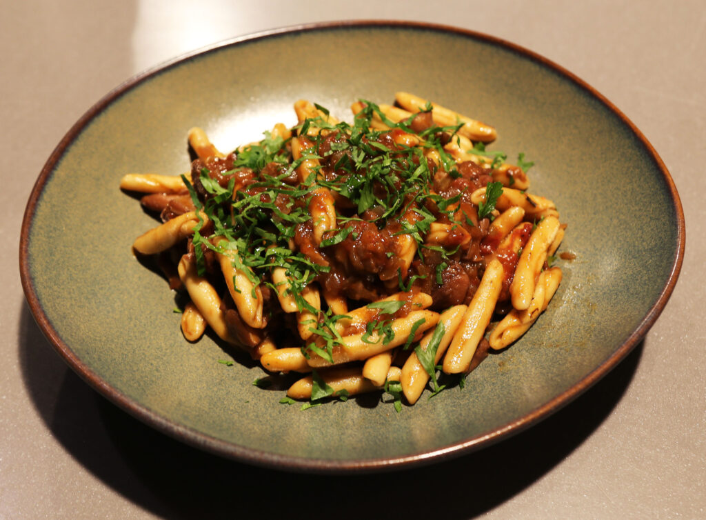 Ponuda potom prelazi na grupu jela nazvanih Pašta, pod kojim se nazivom krije izbor od desetak umaka i sedam odabranih formata tjestenine koji su kreatorima jela odgovarali svojim oblicima kao najbolji izbor. Tjestenine su svježe, a neki umaci se proizvode ranije jer se radi o složenim recepturama kao što su Žgvacet od kokoši ili Ragu a’la bologneze, koji se priprema gotovo pola dana od biranih mesa junetine, teletine i svinjetine obrađene u vlastitoj mesnici.