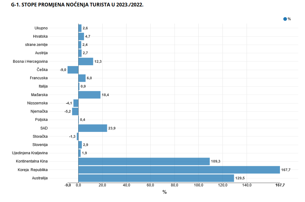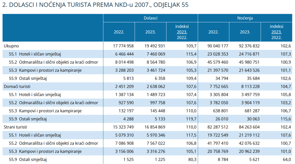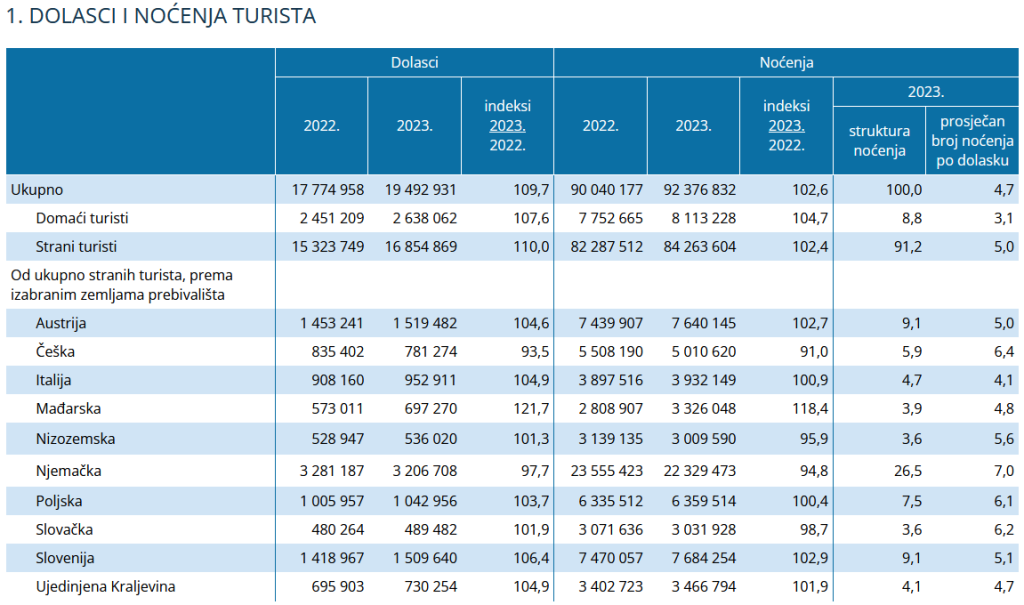 Domaći turisti bilježe rast od 7,6% u dolascima, dok strani turisti ostvaruju impresivnih 10,0% više dolazaka u usporedbi s 2022. Strani turisti čine čak 91,2% ukupnih noćenja, a domaći turisti ostvaruju 8,8%.