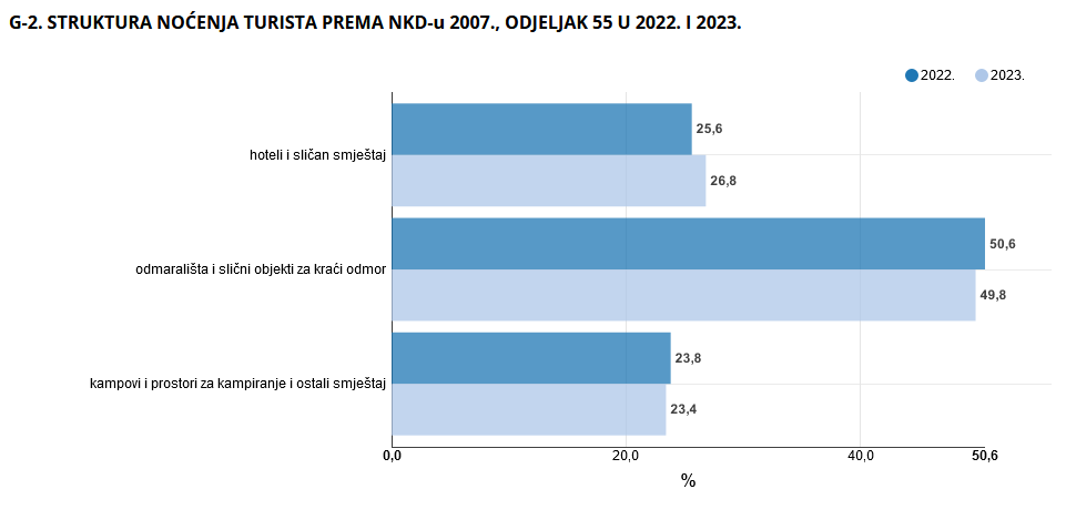 Skupina smještaja, odmarališta i sličnih objekata za kraći odmor bilježe najveći broj noćenja, čineći gotovo 50% ukupnih noćenja. Kampovi i hoteli također ostvaruju značajan broj noćenja, doprinoseći turističkom uspjehu zemlje.
