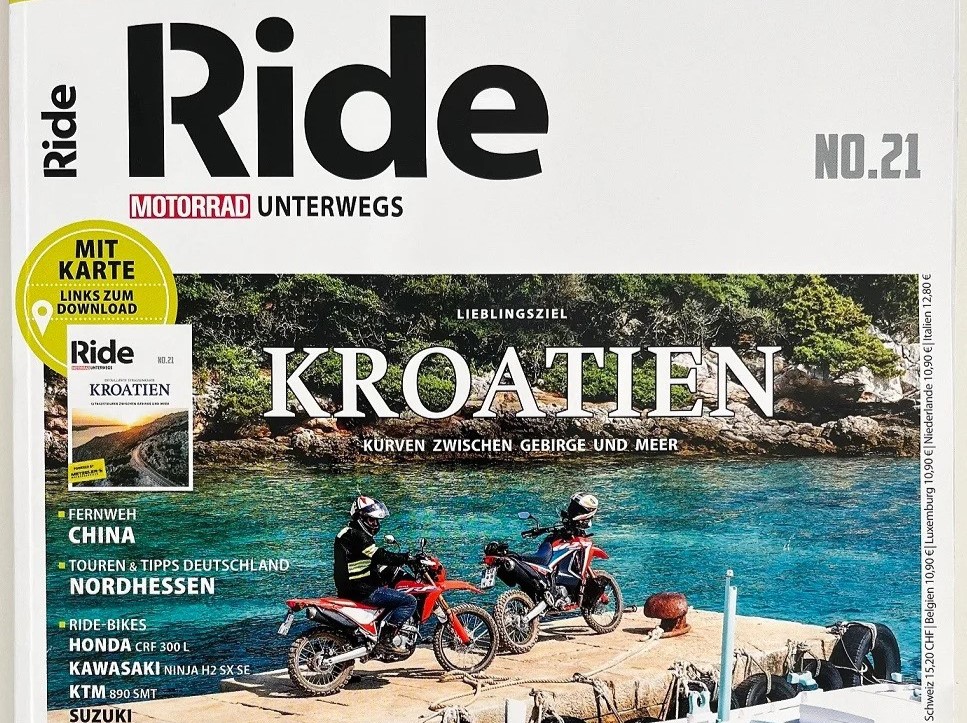 Aktualno izdanje popularnog njemačkog motociklističkog magazina RIDE donosi priču posvećenu našoj zemlji pod naslovom „Omiljena destinacija Hrvatska: serpentine između planina i mora“. Ovaj kvalitetno produciran časopis izlazi na 168 stranica, a velik dio njih posvećen je Hrvatskoj kao atraktivnoj destinaciji te njezinim ljepotama, krajolicima i prometnicama kao stvorenima za sve ljubitelje motocikala.