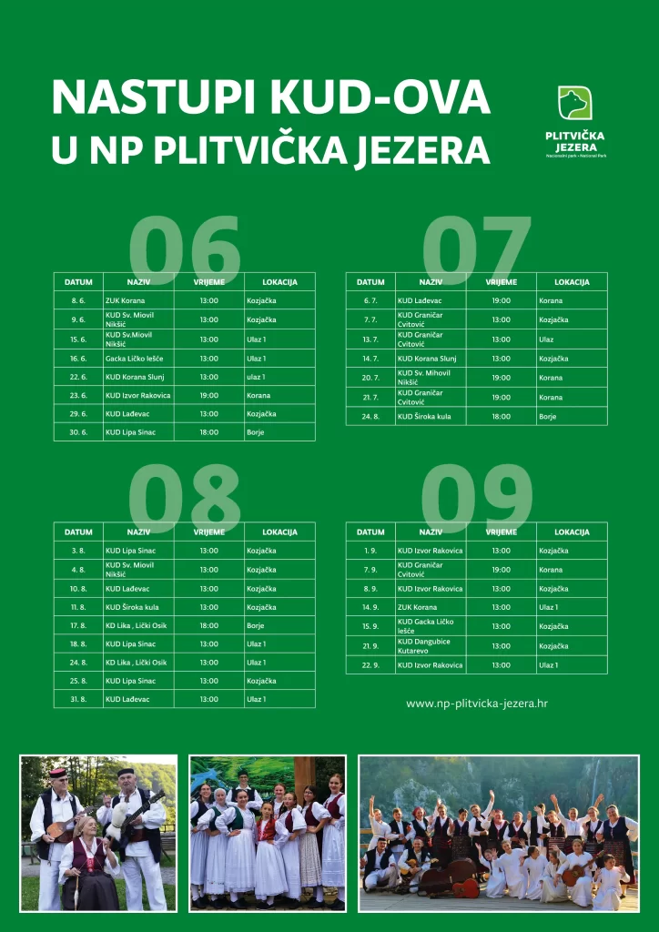 Evo rasporeda nastupa kulturno umjetničkih društava (KUD-ova) na Plitvičkim jezerima tijekom ljeta 2024.: