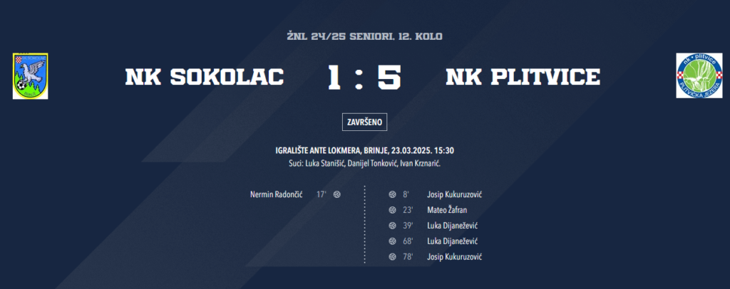 Nogometaši NK Plitvice ostvarili su impresivnu pobjedu u gostima protiv NK Sokolac, završivši susret rezultatom 1:5 u utakmici 12. kola Županijske nogometne lige Ličko-senjske županije. Utakmica je odigrana na igralištu Ante Lokmera u Brinju, 23. ožujka 2025., s početkom u 15:30 sati.