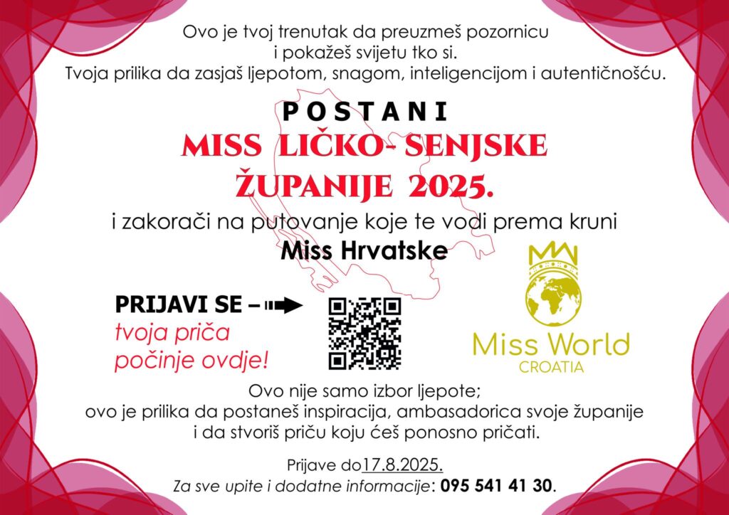 Sanjate o velikoj pozornici, lentama i prilici predstavljanja Ličko-senjske županije na nacionalnom izboru? Prilika je stigla – otvorene su prijave za najprestižnije natjecanje ljepote ovog kraja, a pobjednica dobiva mogućnost ulaska u svijet Miss Hrvatske!