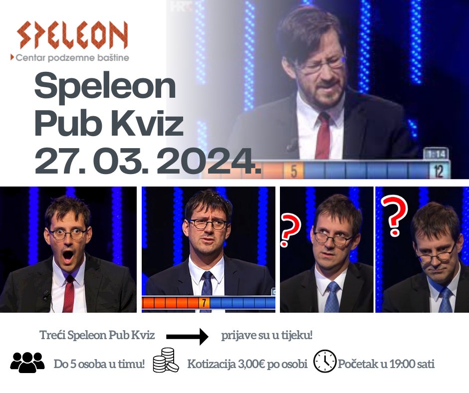 U trećem izdanju Speleon pub kviza, zakazanom za srijedu, 27. ožujka 2024., s početkom u 19:00 sati u Speleonu – Centru podzemne baštine, očekuje se nova doza uzbuđenja i zabave za sve posjetitelje.