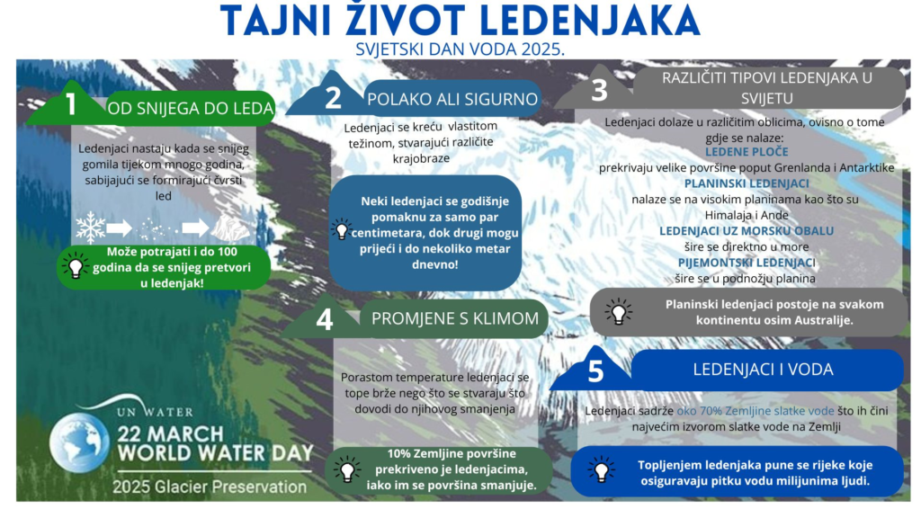 Svjetski dan voda, koji se obilježava 22. ožujka svake godine, ustanovljen je 1993. godine s ciljem podizanja svijesti o važnosti vode za naš život i potrebi njenog održivog korištenja. Ovogodišnja tema je “Očuvajmo ledenjake”, što ističe važnost ledenjaka kao vitalnih izvora slatke vode i stabilizatora klime.